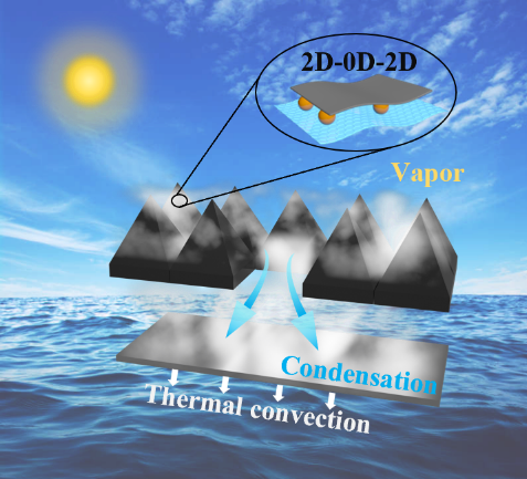 该研究设计了一种可以将热能约束在夹层结构内的光热蒸发器,该蒸发器是将还原氧化石墨烯、煤基碳点和 MXene 依次在三聚氰胺海绵骨架上负载制备而成。得益于其独特的结构和各组分的协同作用,该蒸发器不仅实现了高的蒸发速率和光热转换效率,还展现出了优异的抗盐和抗污染功能。提出了一种基于倒置结构的新型蒸发-冷凝装置,该装置通过将蒸汽冷凝过程置于底部,显著降低了顶部光损耗,同时采用具有疏水涂层的高导热材料作为冷凝收集器,并通过下方大量水体进行冷却,促进潜热耗散,加速滴状冷凝过程。该倒置冷凝装置获得了创新高的水收集速率和太阳能集水效率,是传统单级太阳能净水器的4.6-7.7倍。结合对比实验和理论计算结果表明,光热蒸发器的高蒸发性能与多功能特性以及倒置蒸发-冷凝装置的高效水收集能力,为解决淡水资源短缺问题提供了切实可行的技术方案。