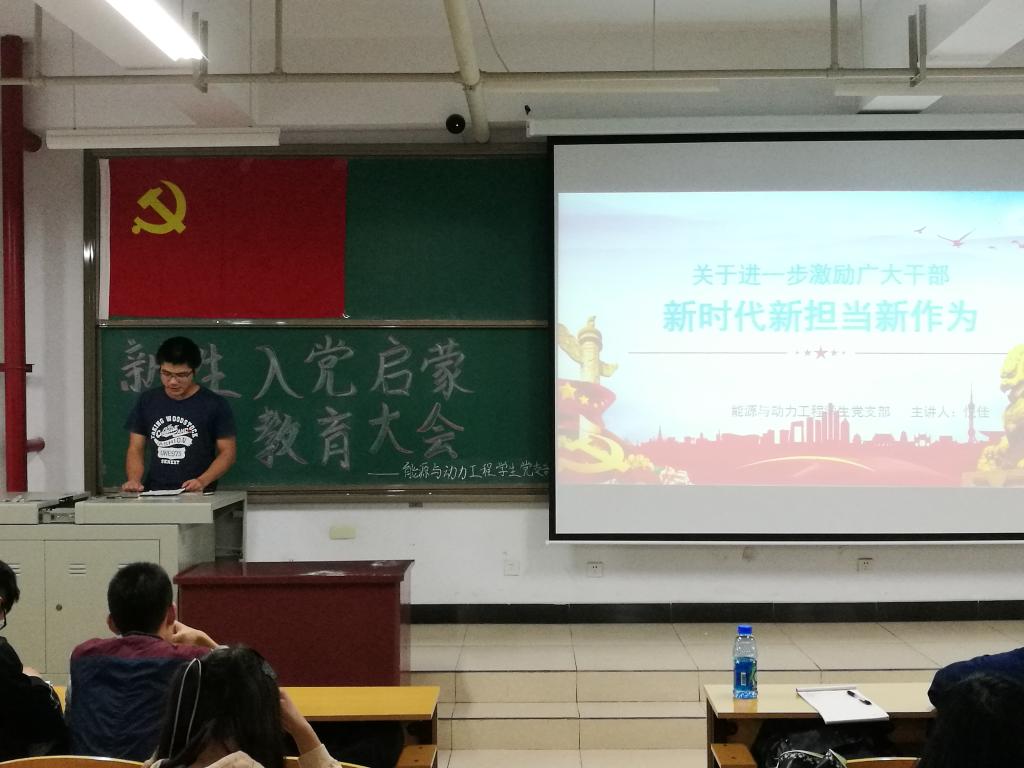 2018年9月25日下午四点三十分,能源与动力工程党支部全体党员在15016H召开了新生入党启蒙大会和“新时代新担当新作为”主题党日活动,全体能源与动力工程专业大一新生到场参加,本次会议由羊光耀同志负责主持。