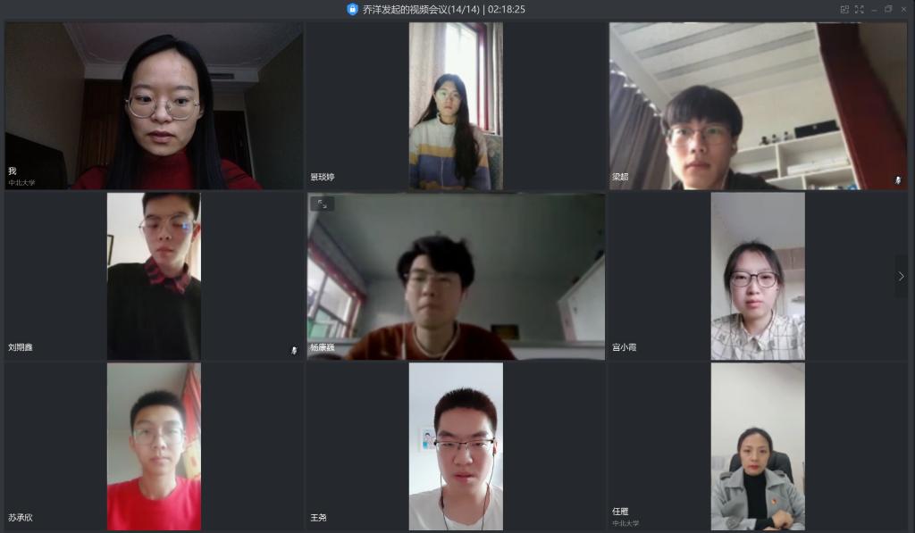 为进一步激发青年学生的爱国情怀,凝聚党员力量,争当战“疫”先锋,头雁领航和柏树林下辅导员工作室结合自身工作实际,将团体辅导应用于学生党员活动中,于3月21日下午面向能源动力工程学生党员骨干联合举办爱国主义云团体活动,头雁领航工作室负责人任雁、柏树林下工作室负责人李晓彧、能源动力工程学院学生党建办公室负责人乔洋、11名党员骨干参加了此次活动。