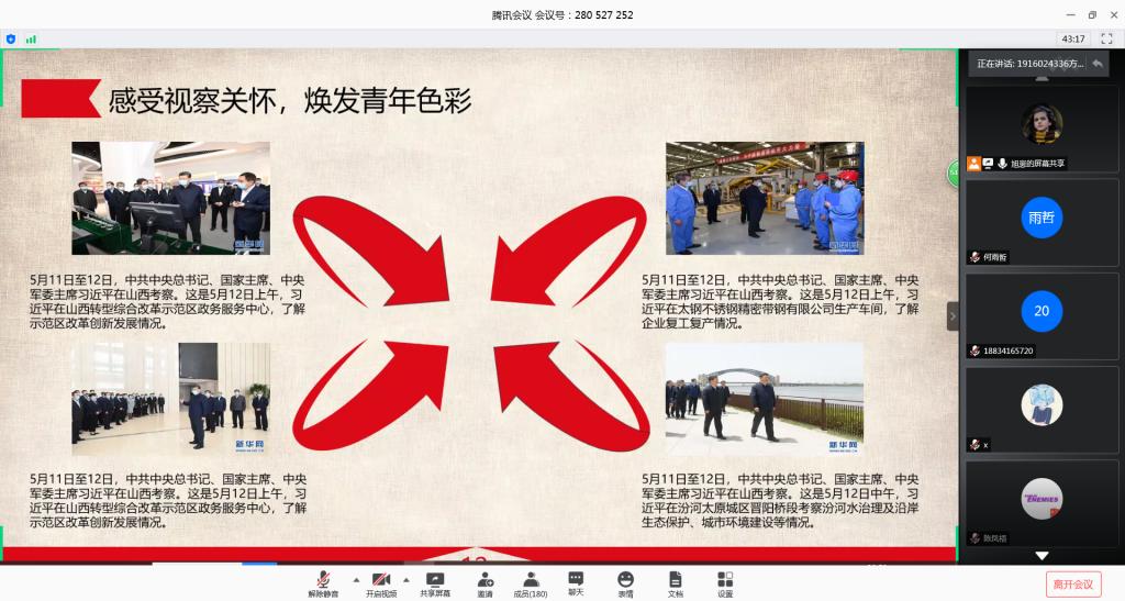 团课学习之后,张鹏、康琦、李旭旭等学生干部、团员、志愿者代表相继分享学习和抗疫志愿服务感悟,同时也表明了自己为梦奋斗的坚定决心;廉政、牛润雨等团支部代表展示系列团日活动成果;最后李晓彧老师进行总结,她首先对同学们的积极的参与和深刻发言给予了肯定与赞赏。同时也针对团课内容分享了自己的想法:我们每个人都肩负着责任和使命,每个人都可以为山西的发展和祖国的发展付出自己的努力,因为付出的人是快乐的。