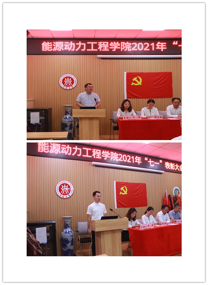 为进一步表扬先进,凝聚力量,激励斗志,鼓舞士气,推动工作,2021年7月1日上午10:00,能源动力工程学院党委在诚学楼115学术报告厅隆重举行庆祝建党100周年暨“七一”表彰大会。学院党委委员、院领导班子成员、在校师生党员代表参加了本次大会。大会由院党委副书记任雁主持。