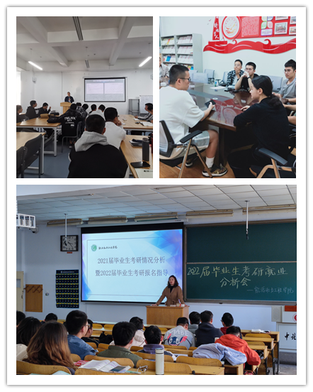 考研招生及调剂政策进行了详细介绍。院党委副书记兼副院长任雁老师对学院近几年毕业生的整体升学和2022年预报名情况进行了详尽的统计分析。院长刘汉涛老师结合个人考研经历鼓励毕业生增强信心,合理选择报考院校,积极备战考研。