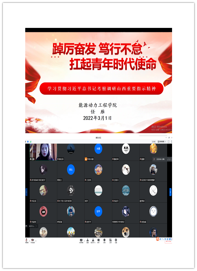 为深入学习贯彻习近平总书记考察调研山西重要指示精神,2022年3月1日下午,能源动力工程学院利用腾讯会议平台为全体学生党员开展宣讲,学院党委副书记任雁以《踔厉奋发笃行不怠,扛起青年时代使命》为主题,带头讲好“开学第一课”。