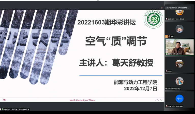 于2022年12月7日上午10点邀请国家自然科学基金委优秀青年科学基金项目获得者——上海交通大学葛天舒教授以《空气“质”调节》为主题在线上开展了第20221603期华彩讲坛。本次讲坛由学院科研副院长胡胜亮教授主持,来自全校300余名教师和研究生参加了本次讲座。