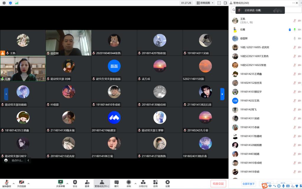 任雁副书记做总结发言,她指出学习宣传贯彻党的二十大精神是当前和今后一个时期的首要政治任务。学院将持续组织开展多形式、分层次、全覆盖的学习宣传教育活动,引导广大青年全面学习、全面把握、全面落实党的二十大精神,深学细悟、常学常新,用勇于追梦的姿态不懈努力,践行新时代青年的使命担当,为学校双一流建设和学院的可持续发展贡献青年力量。