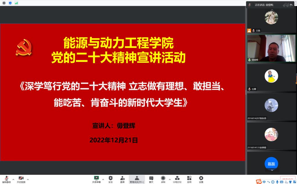 党委召开学习贯彻党的二十大精神线上宣讲会。本场宣讲会邀请校宣讲团成员、学工部毋登辉老师作题为《深学笃行党的二十大精神 立志做有理想、敢担当、能吃苦、肯奋斗的新时代大学生》的专题报告。学院全体学生党员、重点发展对象和入党积极分子260余人参加了此次宣讲。宣讲会由院党委副书记任雁同志主持。